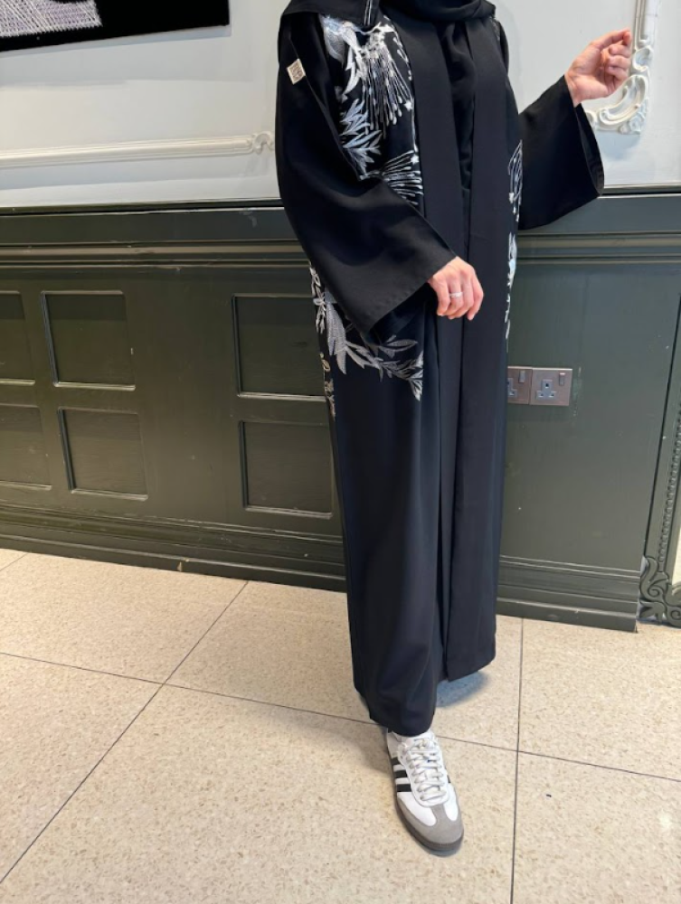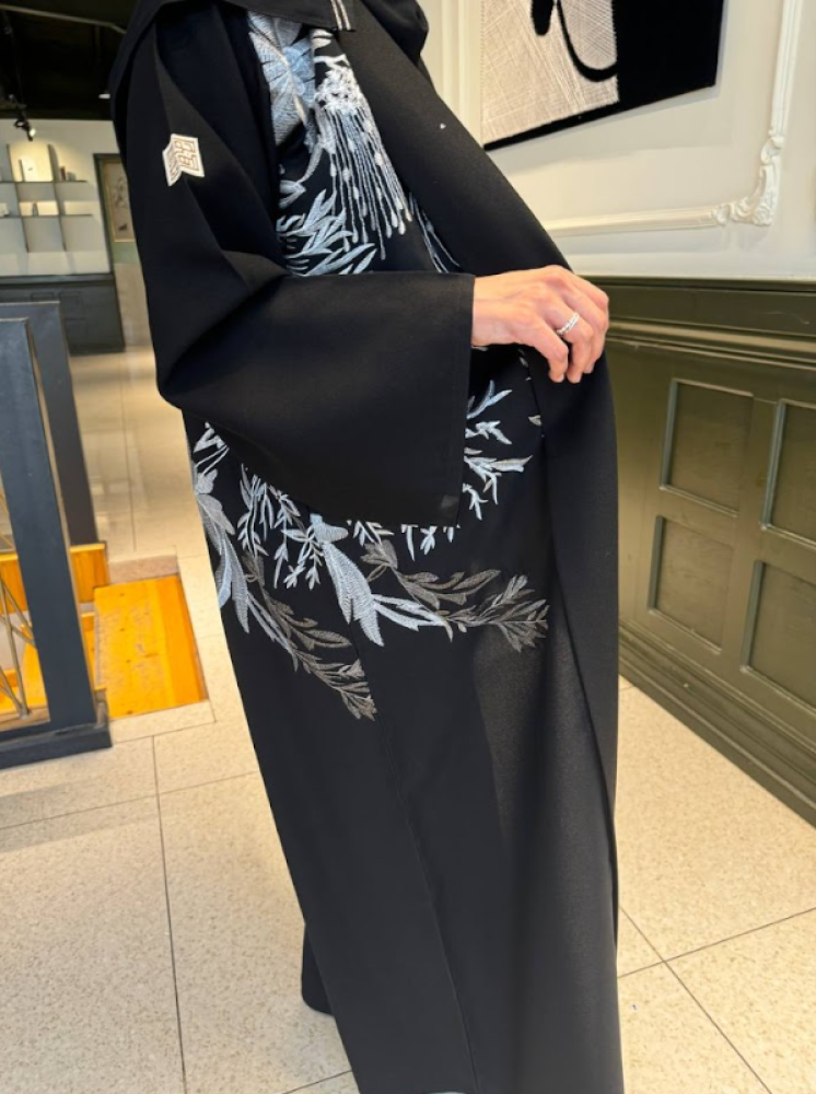 • تجمع عباية بين اللون الأسود الفخم والنقوش البيضاء المميزة، مما يضفي عليها طابعًا من الفخامة والجاذبية.