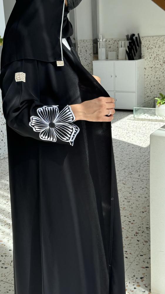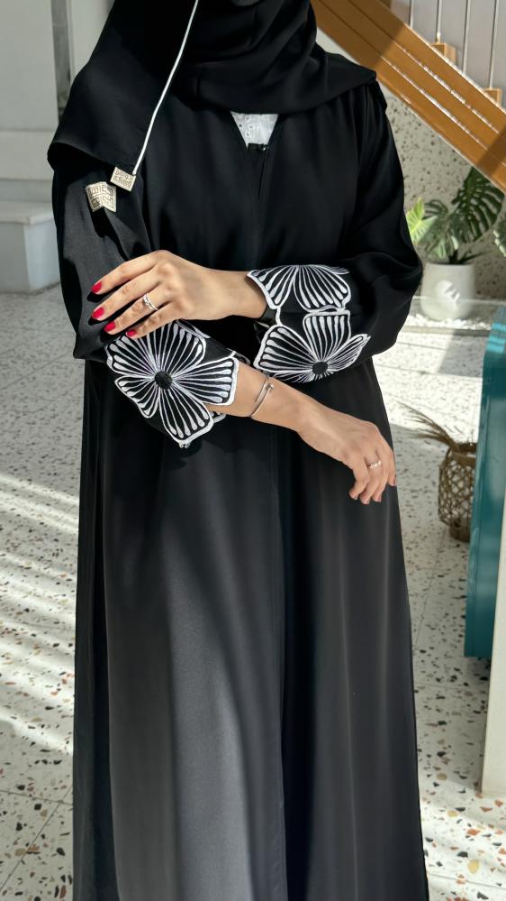 • التطريز الأبيض على شكل زهور كبيرة يضيف لمسة فنية تجعل العباية تبرز بين الملابس الأخرى.