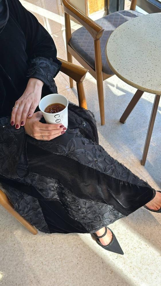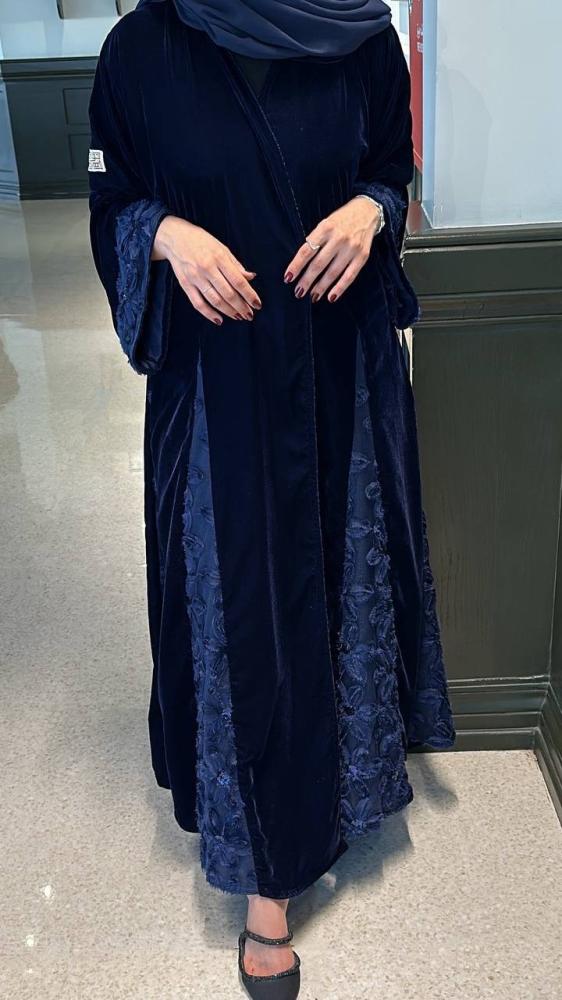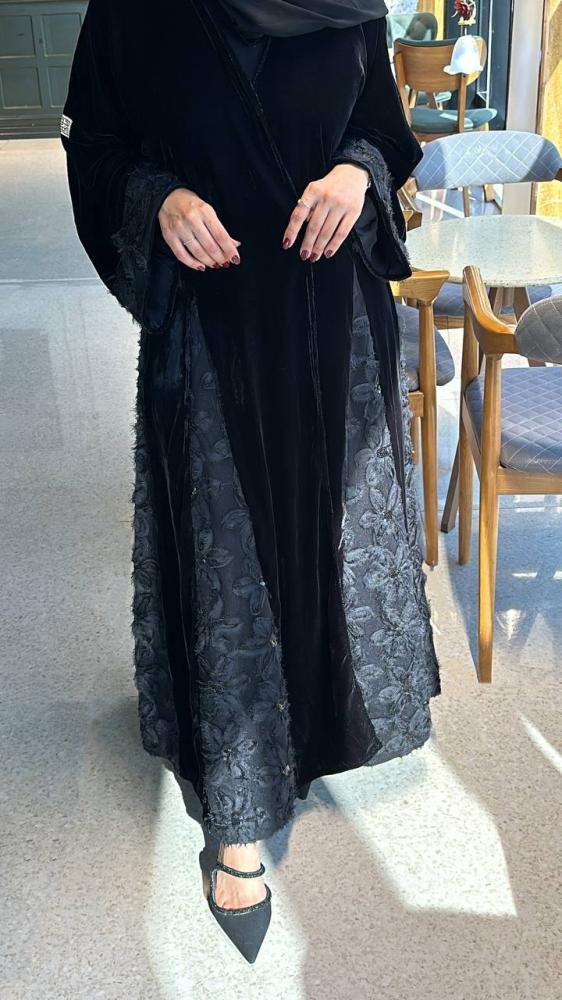 عبايه مخمل كوري اسود مع تدخيلات شك اسود ورود بارزه مع طرحة بتفاصيل العباية